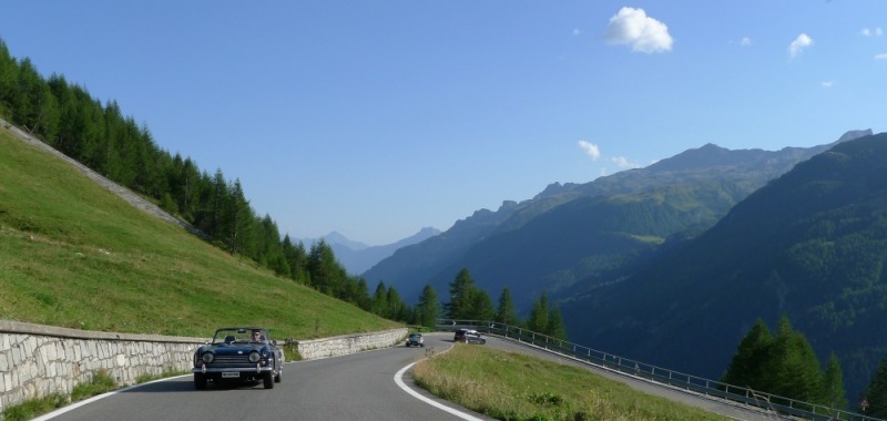 Il y a tellement de beaux cols en Suisse que nous avons voulu faire un autre itinéraire, reprenant quand même certains cols de l’année passée que nous avions bien aimé. Cette fois on est parti à quatre pilotes/quatre british sportscars (Triumph TR5 de votre serviteur, Austin Healey 100/4, Jaguar Type E, Lister MG). Nous voulions être en petits nombre car cela permet une organisation plus « light », en particulier aucune réservation d’hôtels à l’avance. …et aussi un rythme plus soutenu… Cette année, nous avons en plus été bénis par la météo ! Comme il faisait très chaud et que nous étions beaucoup en altitude (Le Stelvio, par exemple, est le plus haut col d’Europe, à quand même 2757 m !), évidemment j’avais quelques craintes par rapport à l’injection de la TR5. Elle n’a causé aucun problème notable! Bien sûr, dans ces conditions, TR5 tournait trop « riche », mais les seuls inconvénients se sont trouvés au niveau d’une fumée noire à l’échappement et d’une très légère baisse de puissance. La consommation a été plutôt élevée, dans les 20 litres, mais on mettra plutôt ceci sur le dos du style de conduite que de l’altitude ! Nous nous sommes concoctés un itinéraire permettant de faire les 16 beaux cols suivants, en trois jours assez intenses, je peux vous vraiment vous recommander: - Furka 2431m *** - Klausen 1948m **** - Wolfgang 1631m * - Flüela 2383m *** - Petit col Martina/CH->Nauders/Autriche ** - Passo di Resia 1504m Autriche->Italie * - Stelvio 2757m **** - Umbrail 2501m Italie->Suisse **** - Ofen 2149m *** - Maloja 1815m, CH->Italie ** - Splügen 2113m Italie->CH **** - San Bernardino 2065m **** - Lukmanier 1914m **** - Oberalp 2044m *** - Susten 2224m *** - Jaun 1509m *** A toutes fins utiles, j’ai mis rétrospectivement de 1 à 4 étoiles aux cols en fonction de leur intérêt. A noter que tout le monde a envie de faire le Stelvio au moins une fois dans sa vie, ce qui est bien compréhensible, mais la rançon de ce succès est que ce col est vraiment très encombré de trafic touristique. C’est le seul où le trafic a gâché un peu notre plaisir. Sur la carte cela donne ceci :